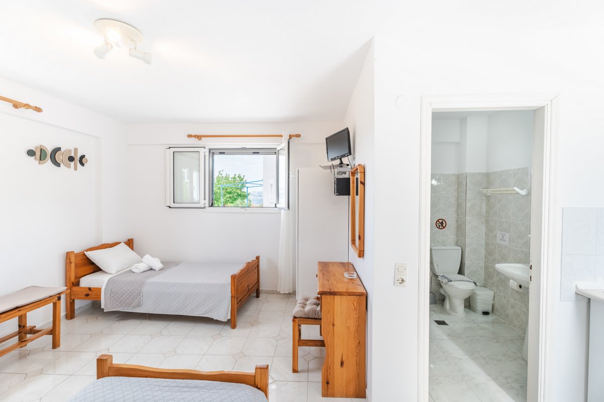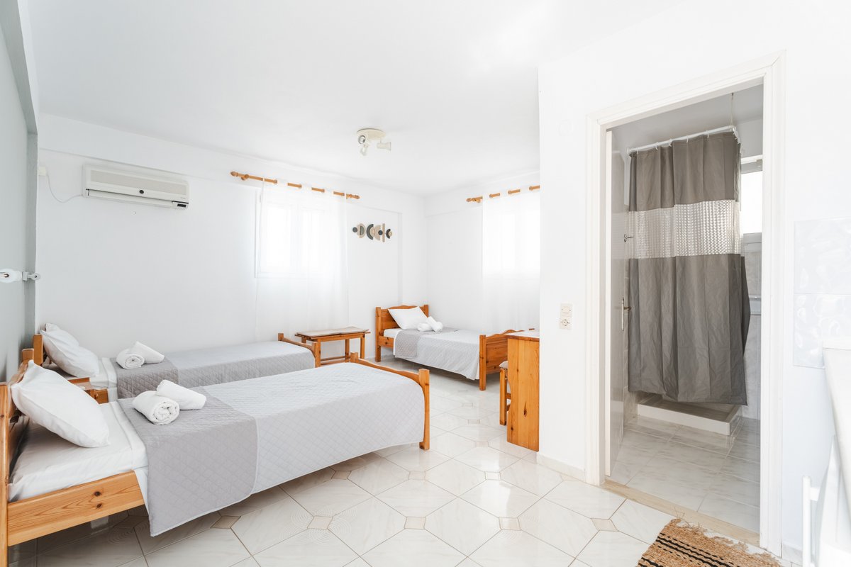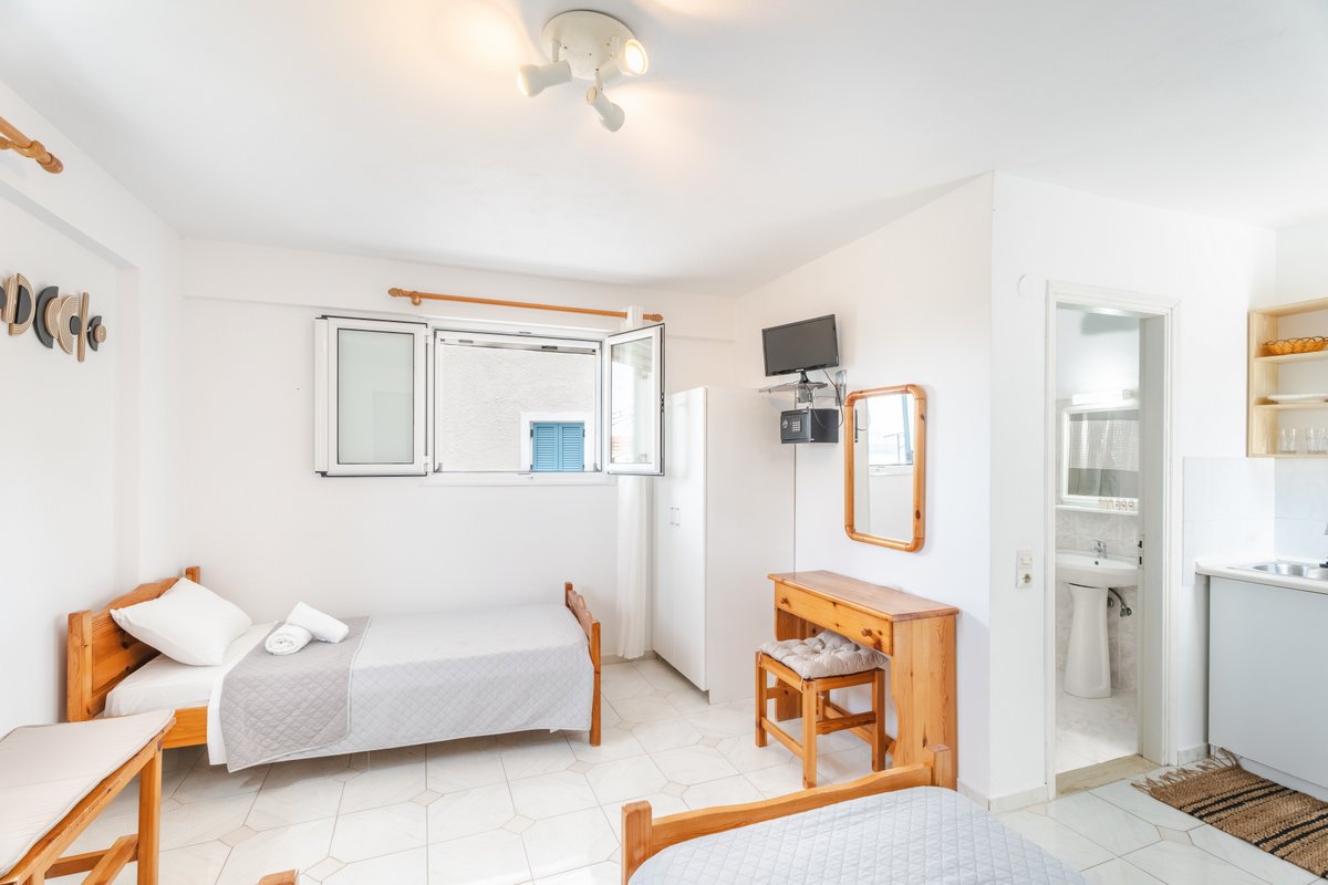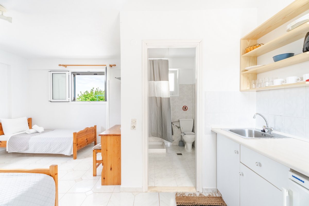 The studio features three single beds, a private bathroom and a practical kitchenette equipped with the essentials for preparing light meals during your stay. The comfortable layout and natural light create a welcoming and pleasant atmosphere.