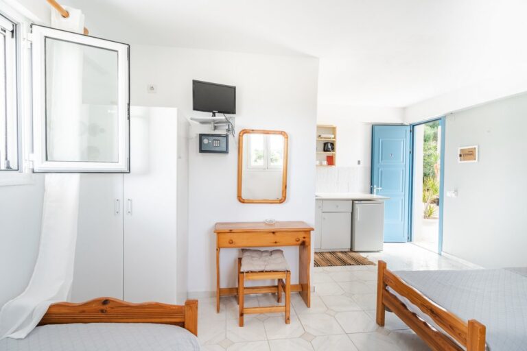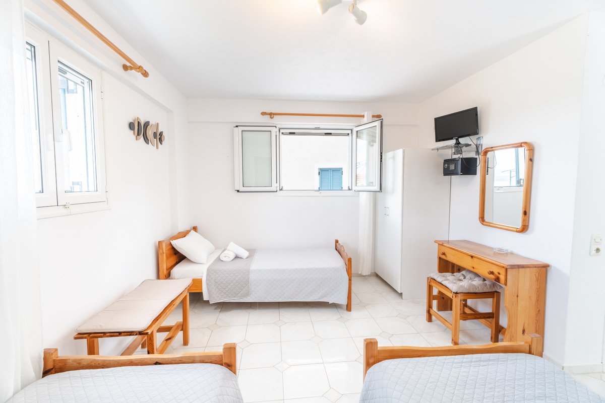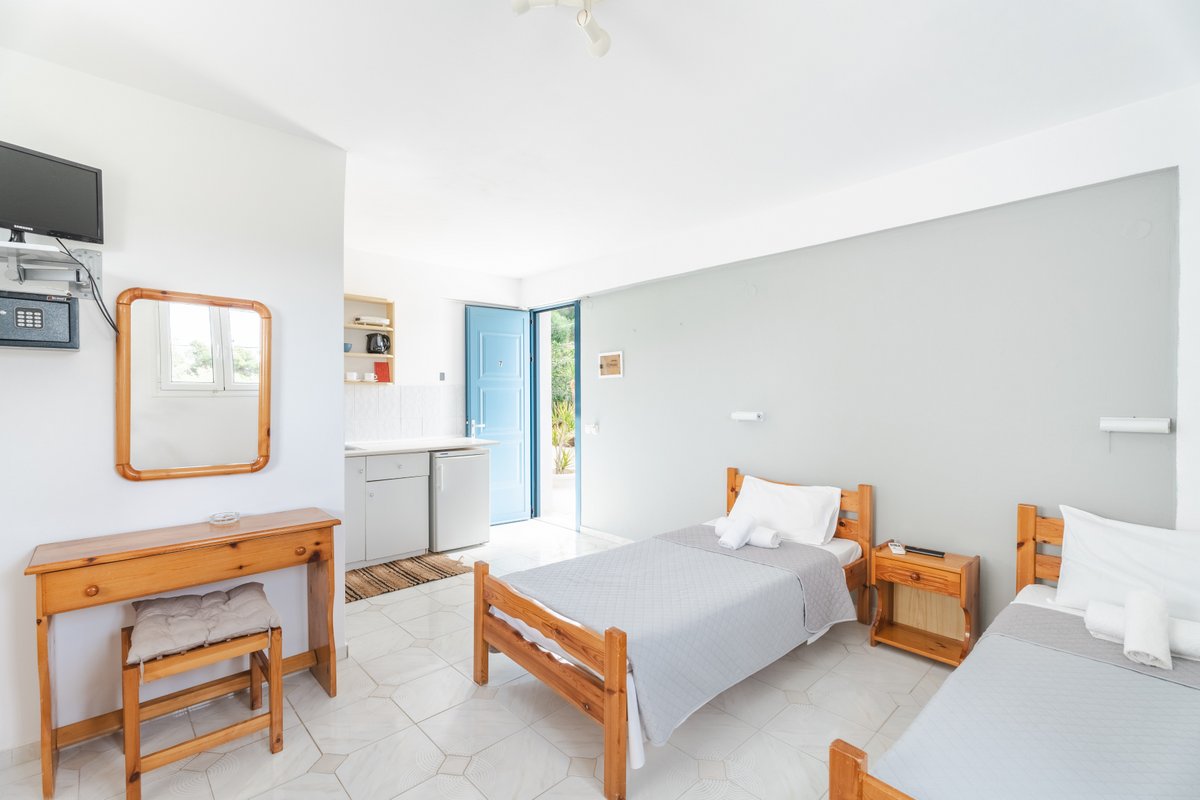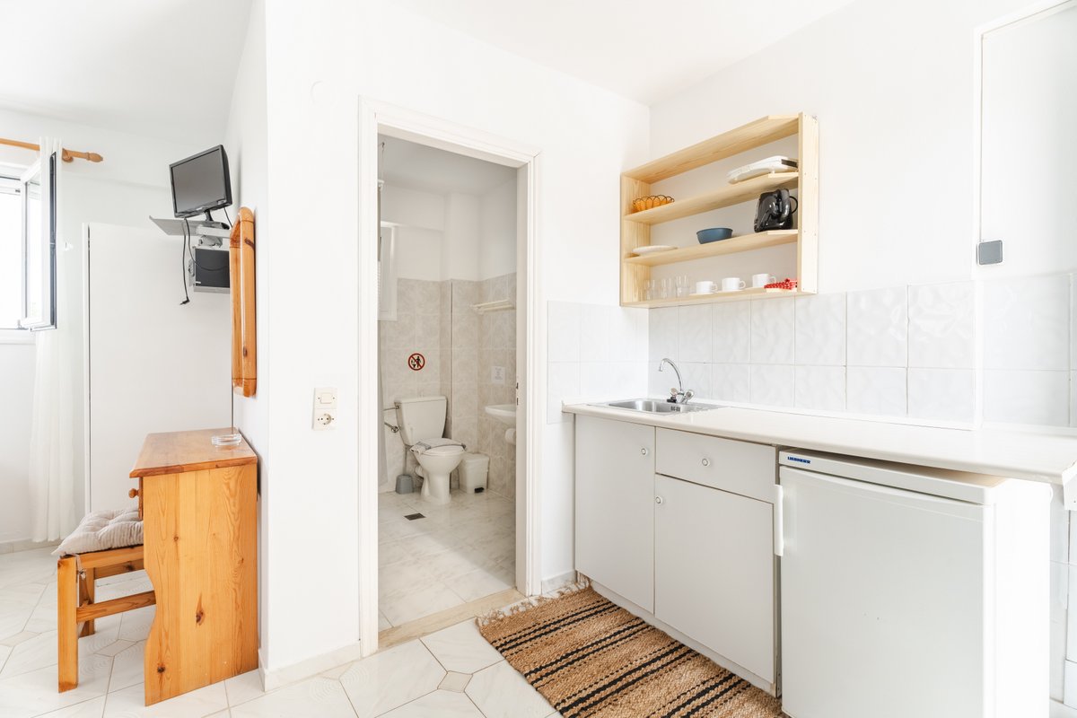 The studio features three single beds, a private bathroom and a practical kitchenette equipped with the essentials for preparing light meals during your stay. The comfortable layout and natural light create a welcoming and pleasant atmosphere.