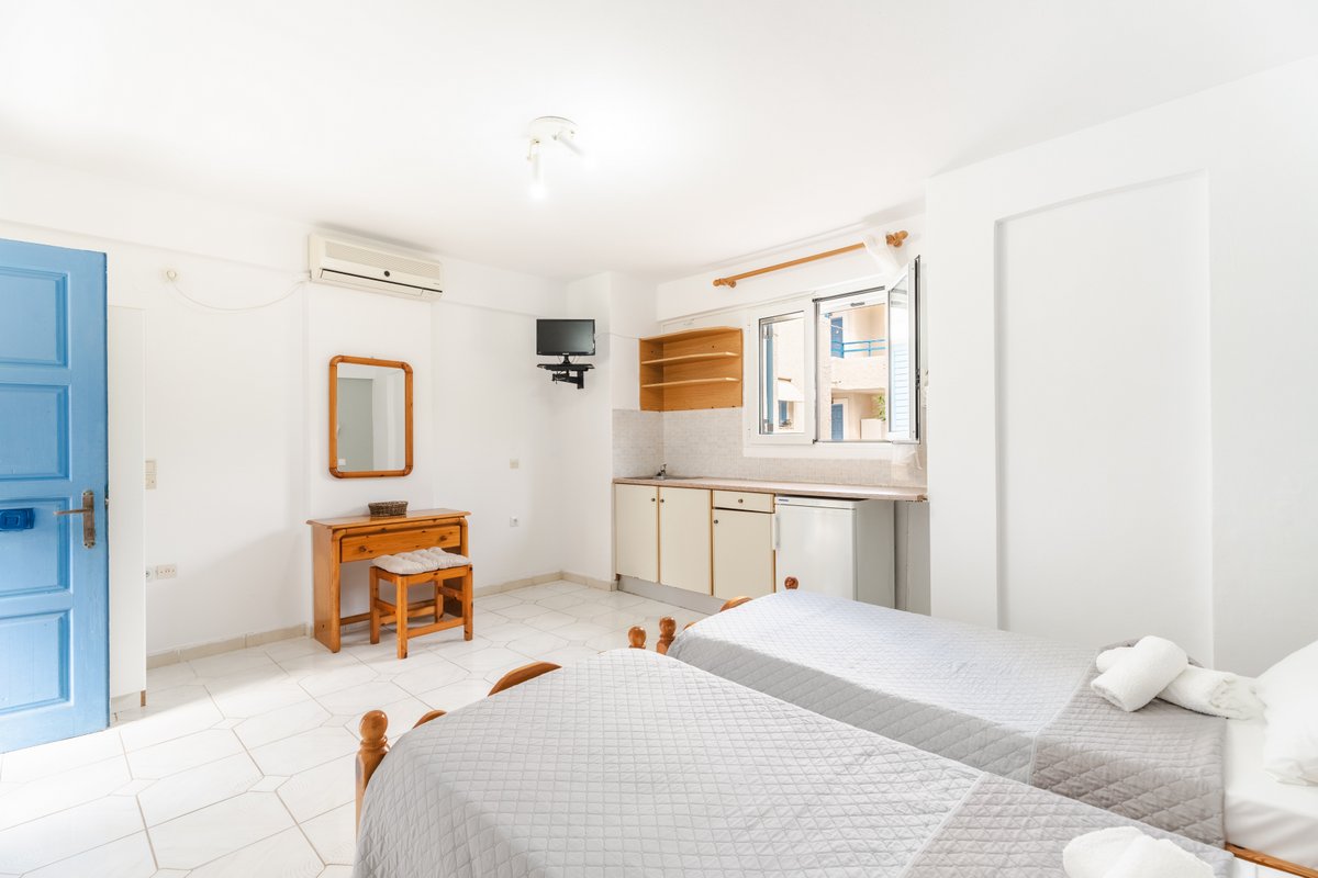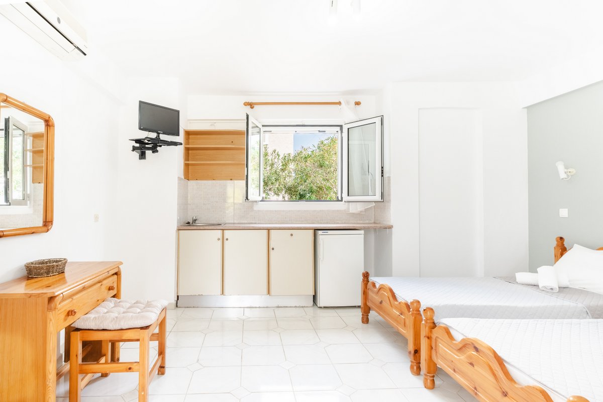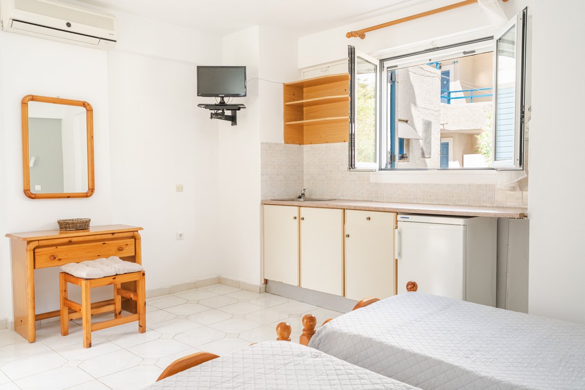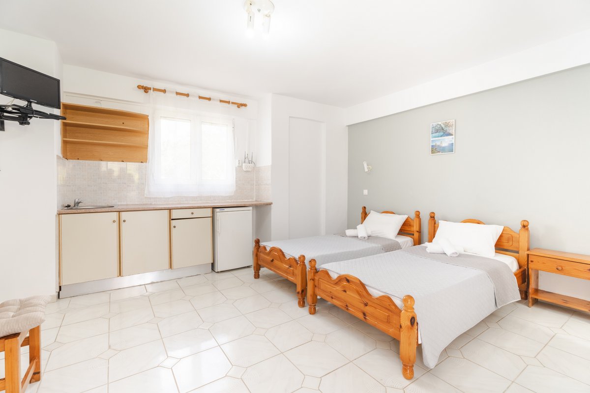The studio features two single beds, a private bathroom and a practical kitchenette with stovetop and refrigerator, allowing guests to prepare simple meals during their stay. Large windows bring plenty of natural light into the space, creating a welcoming and airy environment.