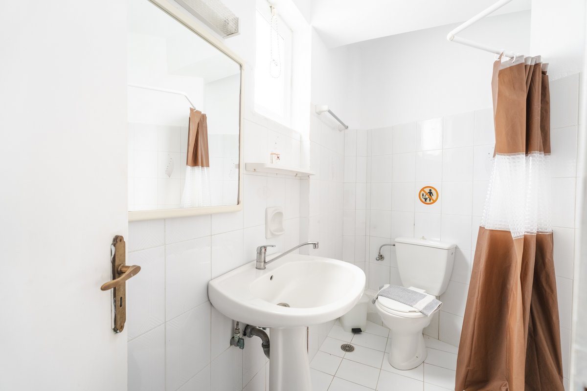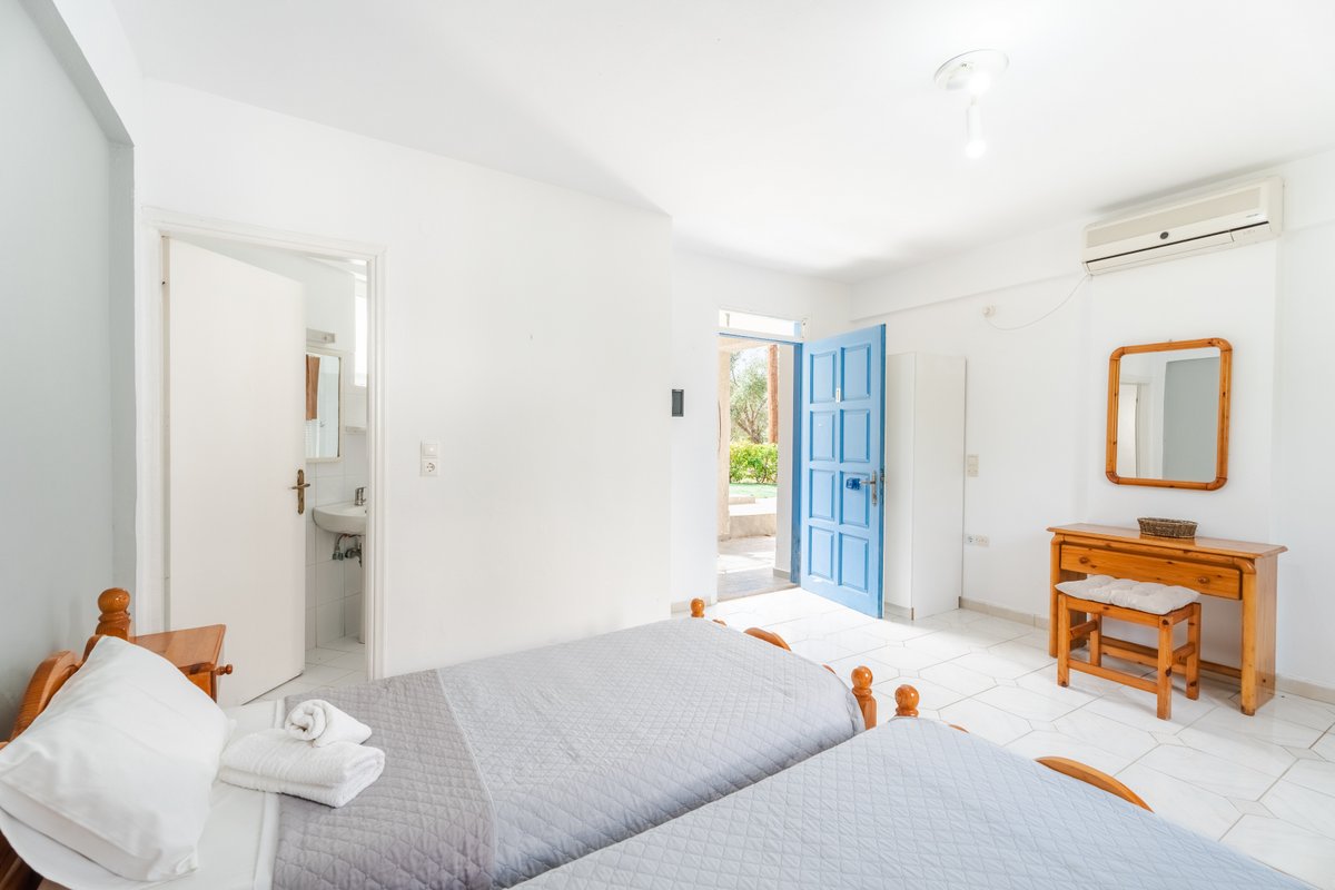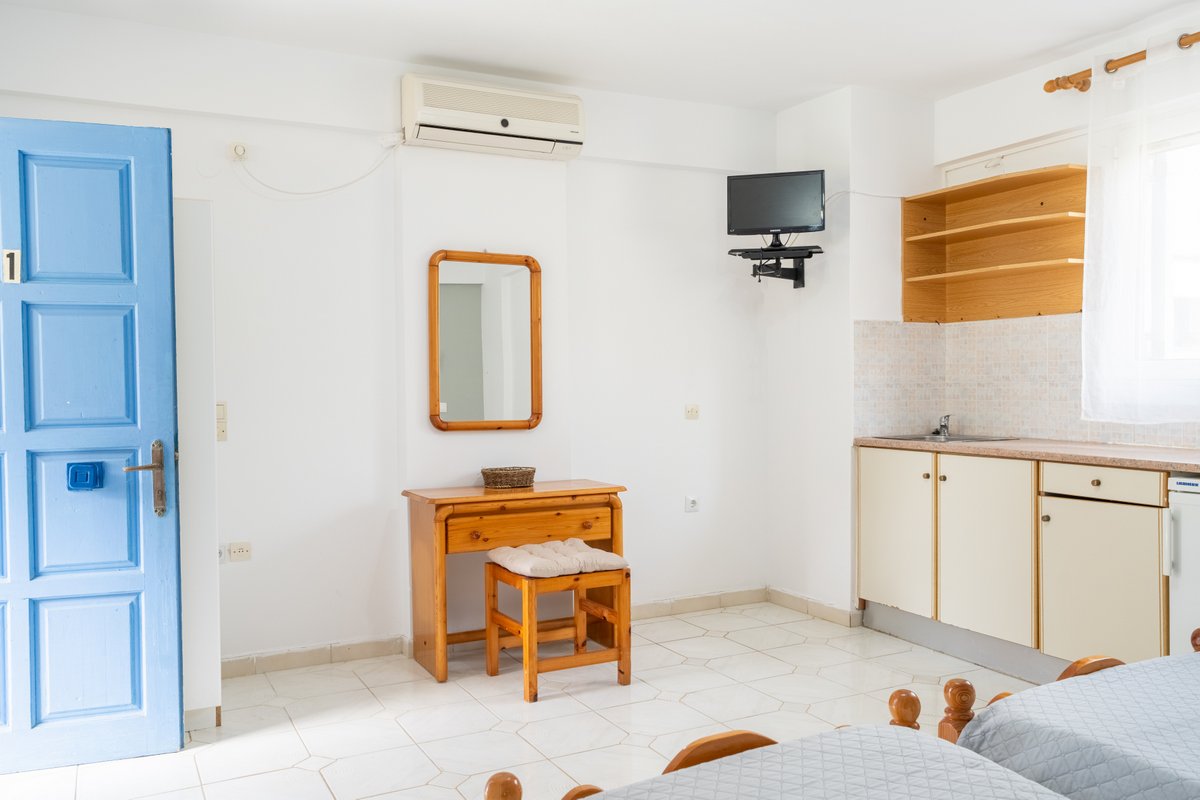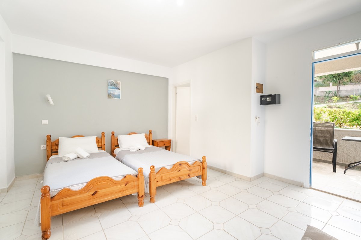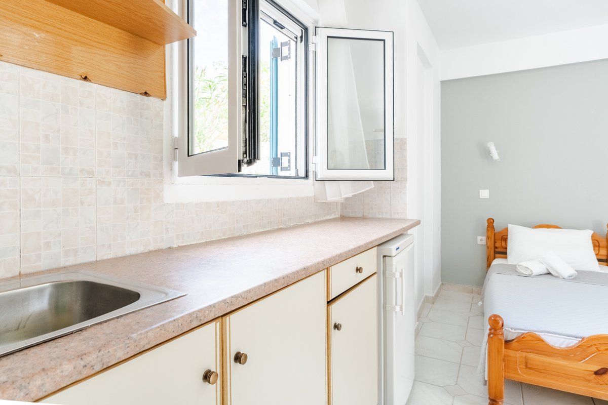 The studio features two single beds, a private bathroom and a practical kitchenette with stovetop and refrigerator, allowing guests to prepare simple meals during their stay. Large windows bring plenty of natural light into the space, creating a welcoming and airy environment.