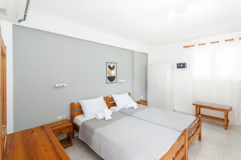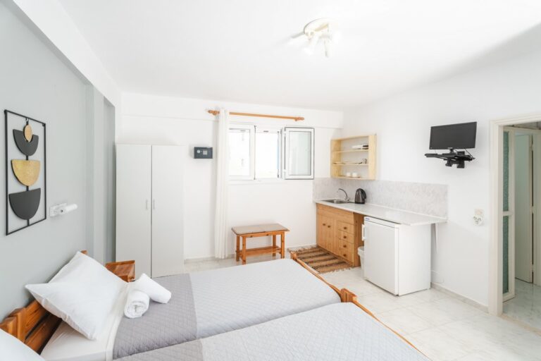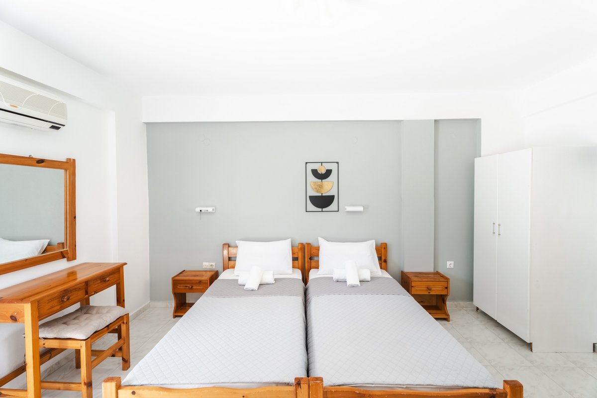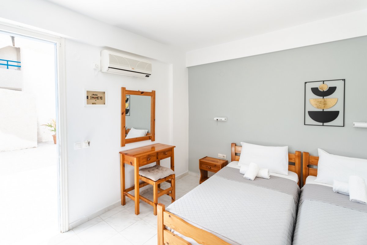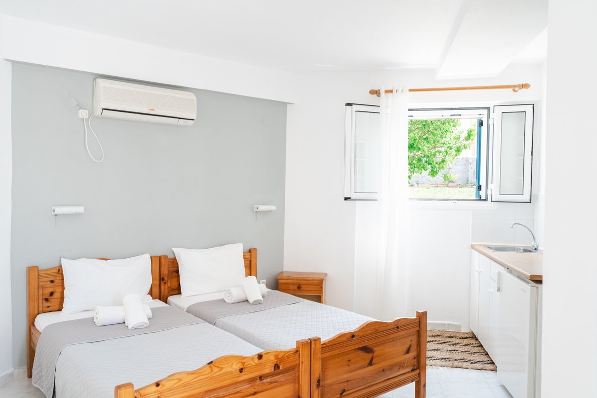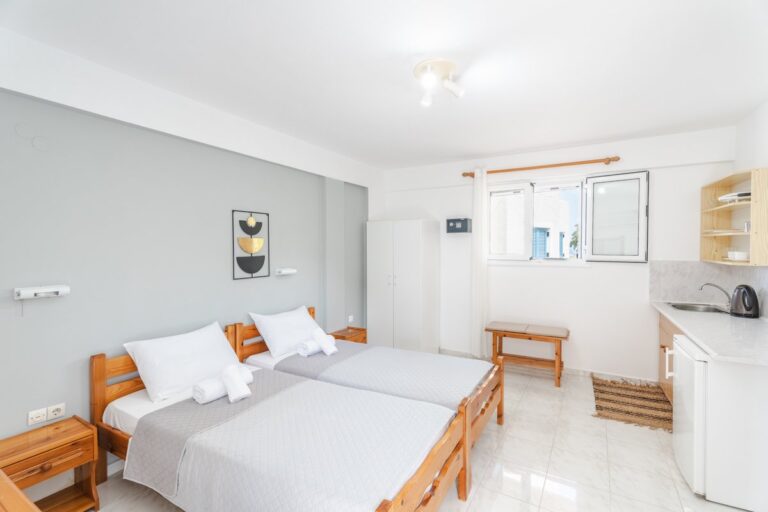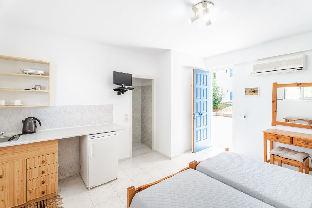 The studio features two single beds, a private bathroom and a practical kitchenette equipped with the essentials for preparing light meals. Guests can also enjoy the outdoor patio area, creating a pleasant space to relax during the day.