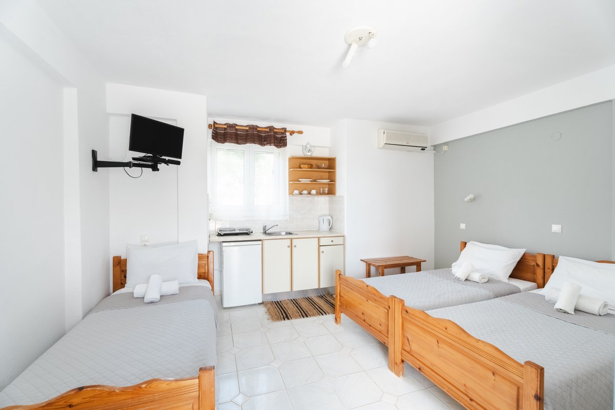 The studio includes three single beds, making it ideal for small groups or families. Guests can enjoy the convenience of a private bathroom and a practical kitchenette equipped with the essentials for preparing light meals during their holiday.